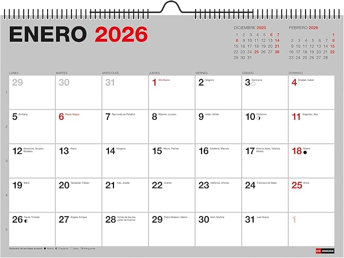 • ☑ INCLUYE calendario anual en el dorso de cada mes, festivos nacionales, autonómicos y de capitales de provincia, carátula explicativa, calendario 2027, onomástica y fases lunares.