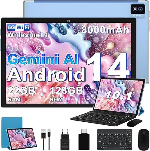 Tablet Android Tablet 10 Pulgadas, 22GB RAM + 128GB ROM (TF 1TB), 5G+2.4G Dual Band WiFi 6, Widevine L1 / 8000mAh / Octa-Core 2.0 GHz/GMS / 5MP+8MP / BT5.0 / GPS, con Teclado y Raton Azul